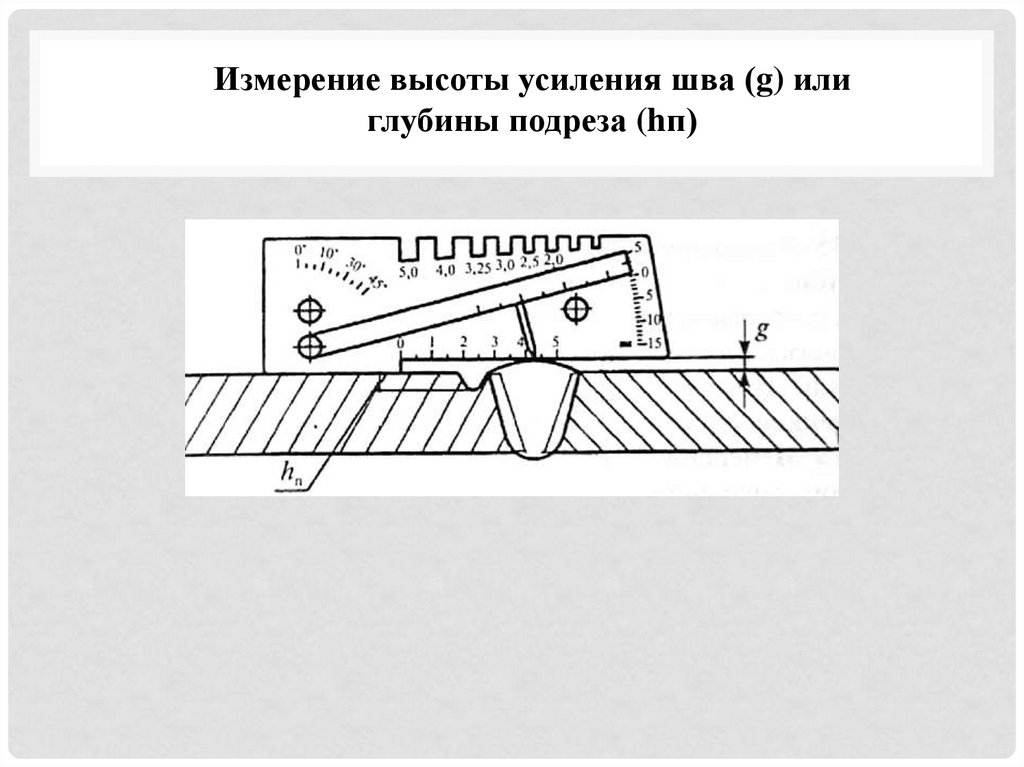 Измерение высоты усиления шва (g) илиглубины подреза (hп)