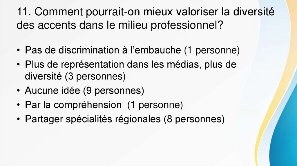 11. Comment pourrait-on mieux valoriser la diversitédes accents dans le milieu professionnel?
