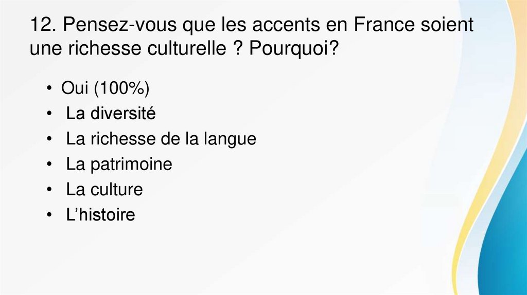 12. Pensez-vous que les accents en France soientune richesse culturelle ? Pourquoi?