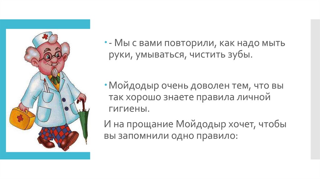 - Мы с вами повторили, как надо мытьруки, умываться, чистить зубы.