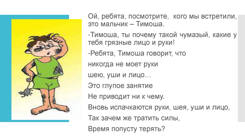 Давайте возьмём Тимошу с собой, кМойдодыру и вместе отгадаем загадки,