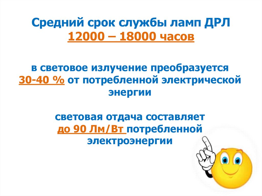 Средний срок службы ламп ДРЛ12000 – 18000 часов