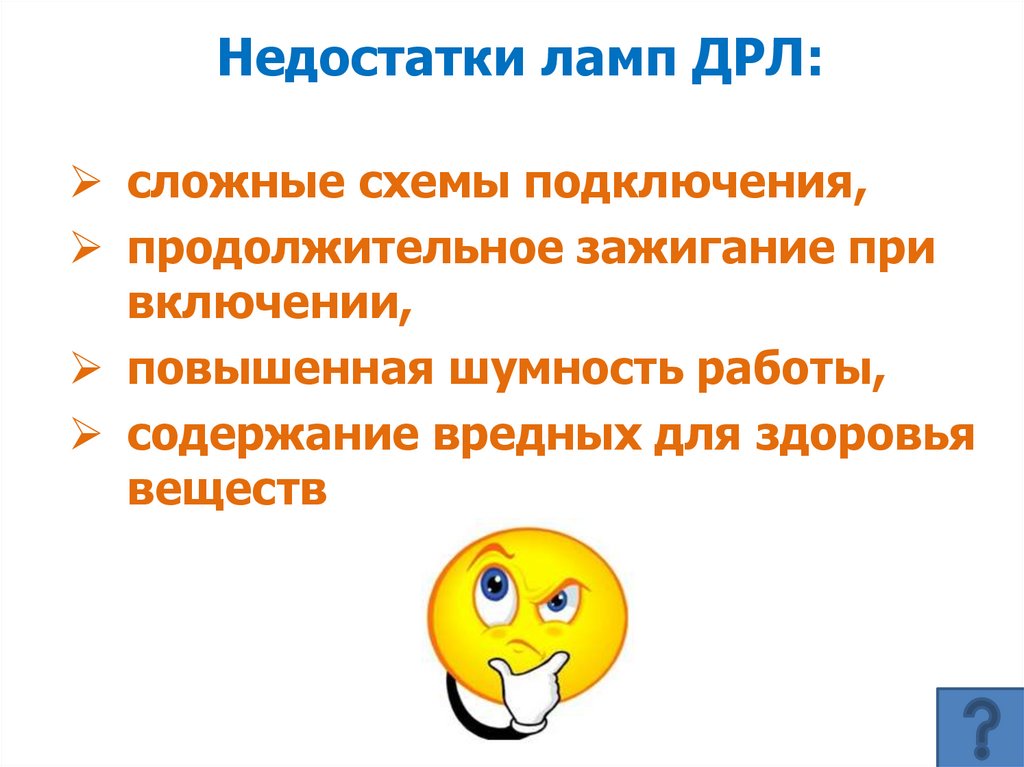 Недостатки ламп ДРЛ:сложные схемы подключения,