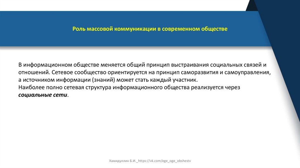 Роль массовой коммуникации в современном обществеВ информационном обществе меняется общий принцип выстраивания социальных связей и