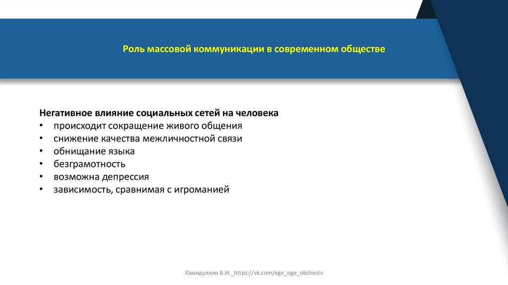 Роль массовой коммуникации в современном обществеНегативное влияние социальных сетей на человека