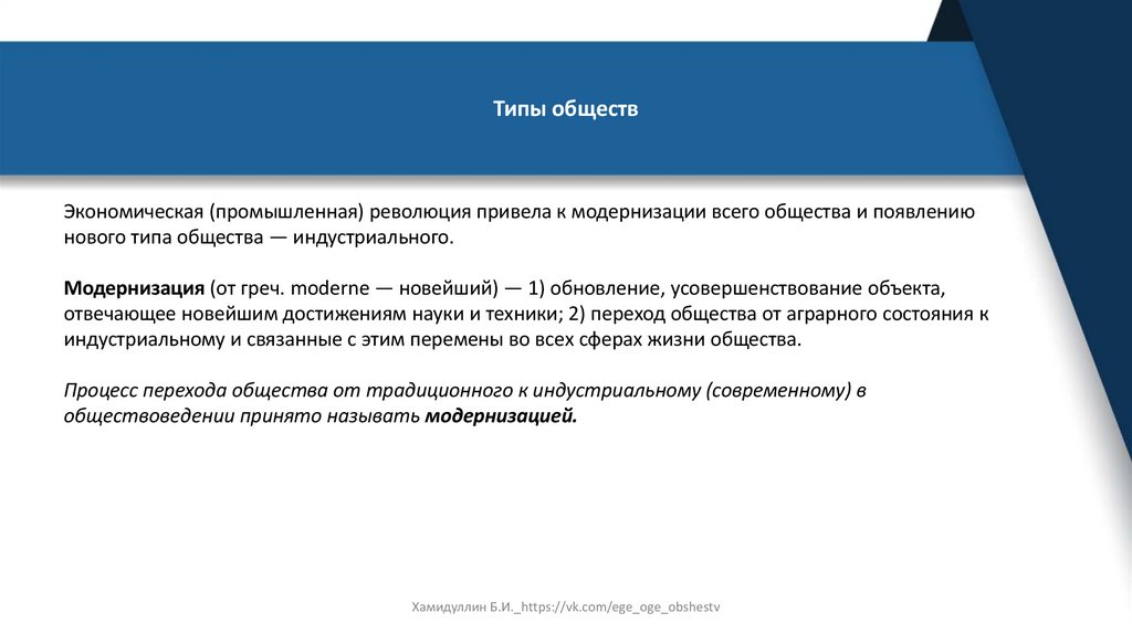 Типы обществЭкономическая (промышленная) революция привела к модернизации всего общества и появлению