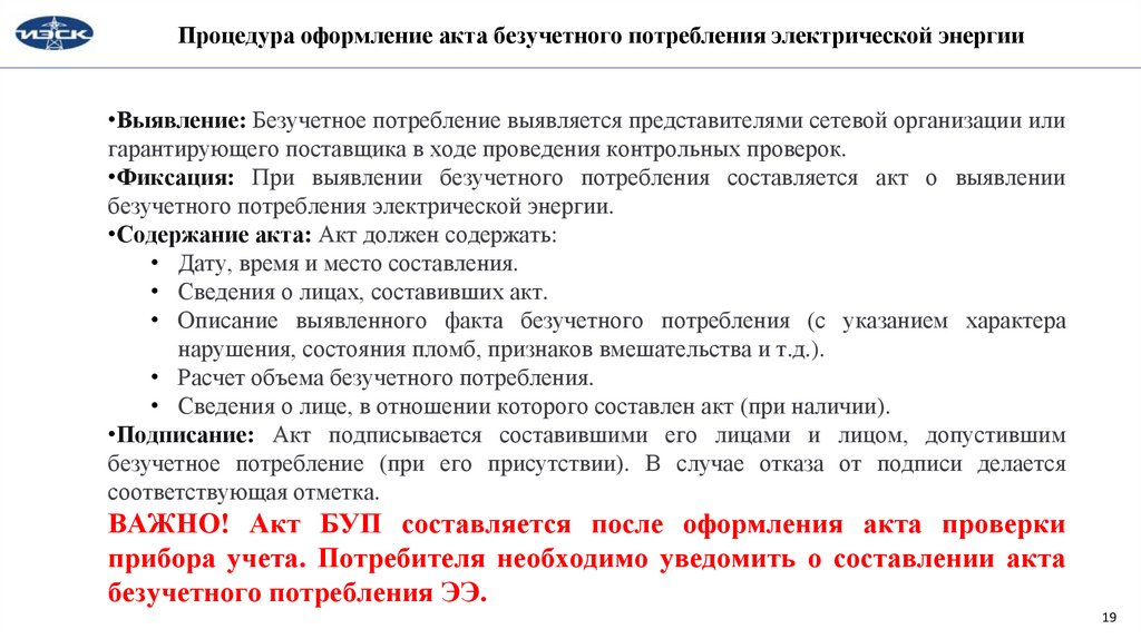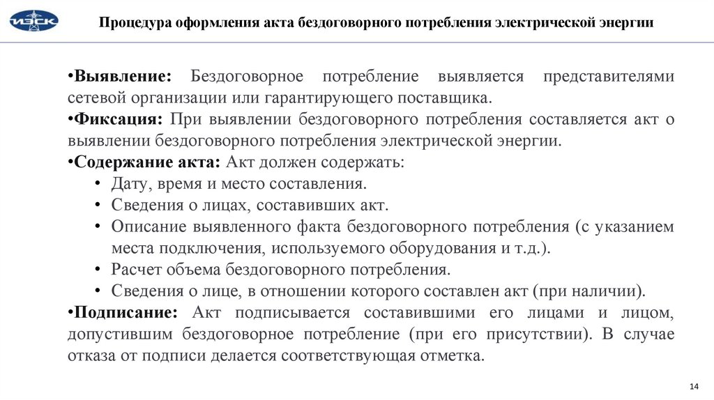 Процедура оформление акта безучетного потребления электрической энергии•Выявление: Безучетное потребление выявляется представителями сетевой организации или