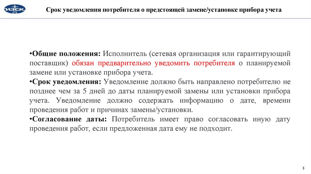 Срок уведомления потребителя о предстоящей замене/установке прибора учета•Общие положения: Исполнитель (сетевая организация или гарантирующий