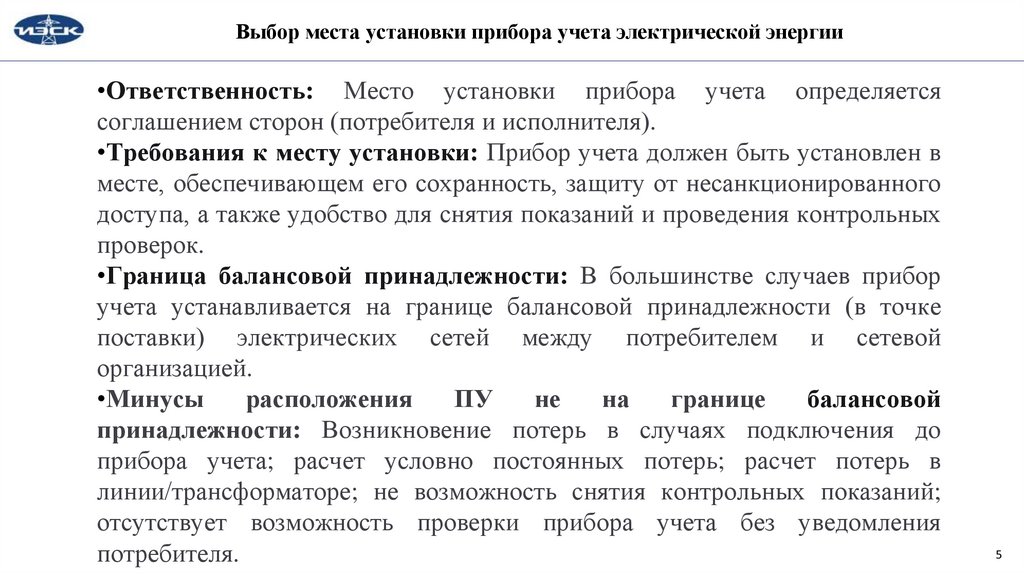 Выбор места установки прибора учета электрической энергии•Ответственность: Место установки прибора учета определяется