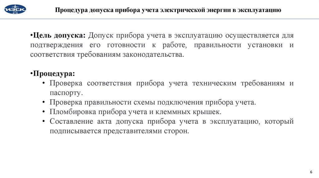 Процедура допуска прибора учета электрической энергии в эксплуатацию•Цель допуска: Допуск прибора учета в эксплуатацию осуществляется для