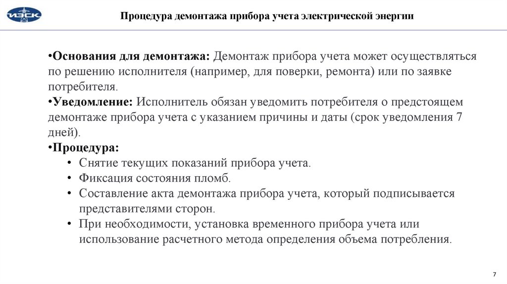 Процедура демонтажа прибора учета электрической энергии•Основания для демонтажа: Демонтаж прибора учета может осуществляться
