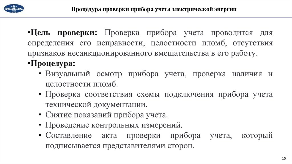 Процедура проверки прибора учета электрической энергии•Цель проверки: Проверка прибора учета проводится для
