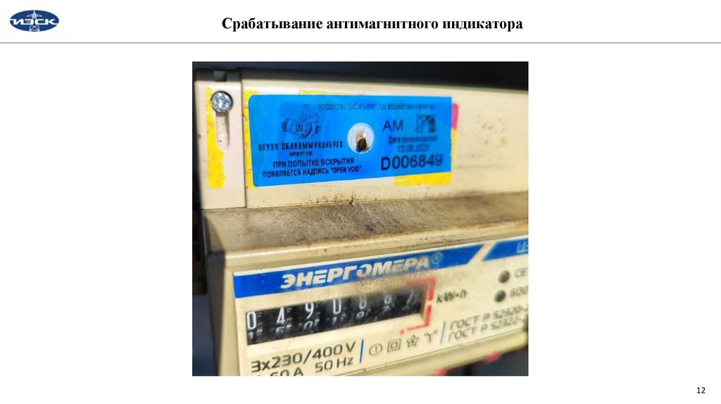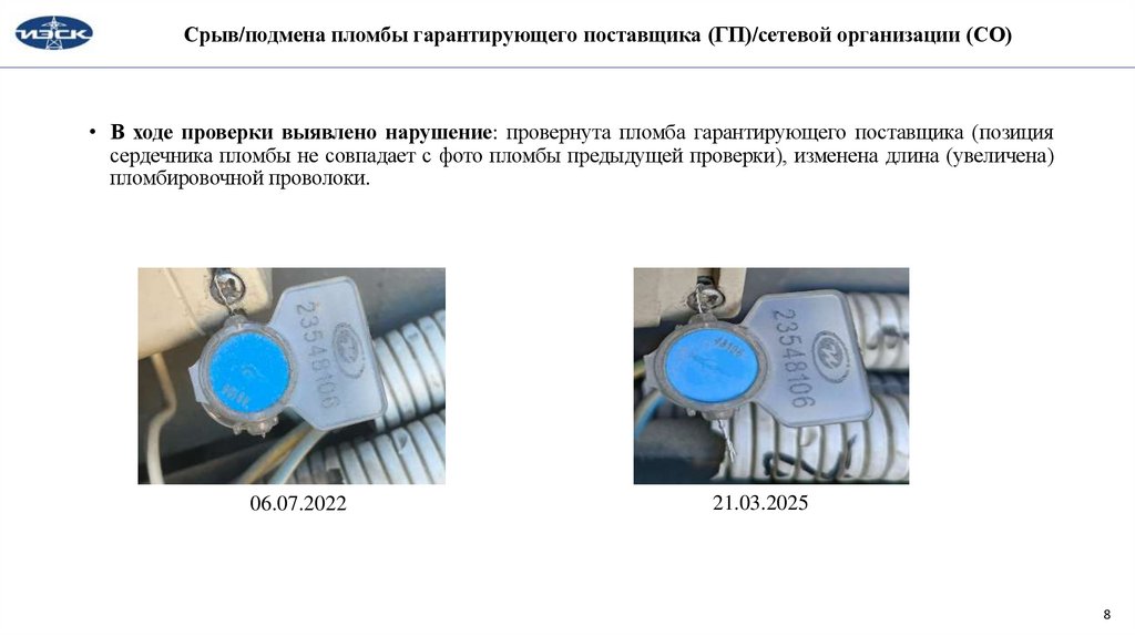 Срыв/подмена пломбы гарантирующего поставщика (ГП)/сетевой организации (СО)• В ходе проверки выявлено нарушение: провернута пломба гарантирующего поставщика (позиция