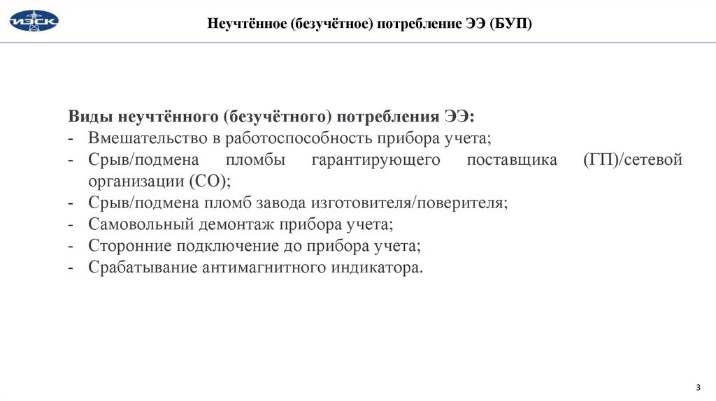 Неучтённое (безучётное) потребление ЭЭ (БУП)Виды неучтённого (безучётного) потребления ЭЭ: