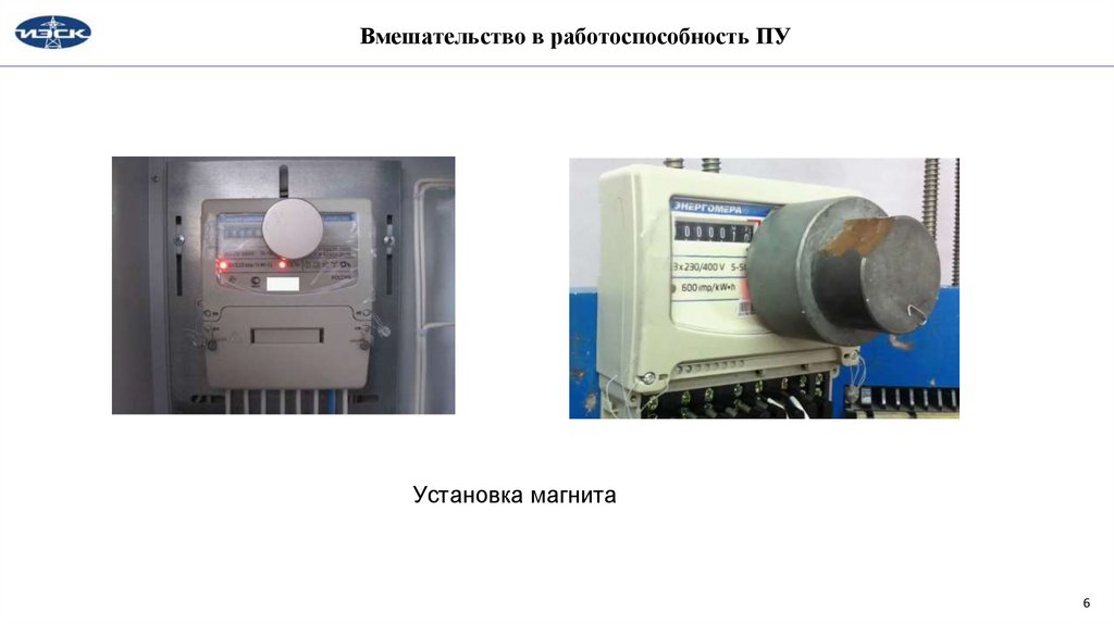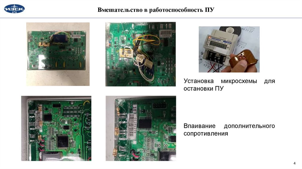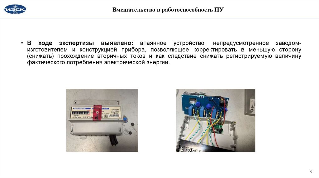 Вмешательство в работоспособность ПУ• В ходе экспертизы выявлено: впаянное устройство, непредусмотренное заводомизготовителем и конструкцией прибора, позволяющее корректировать в меньшую сторону