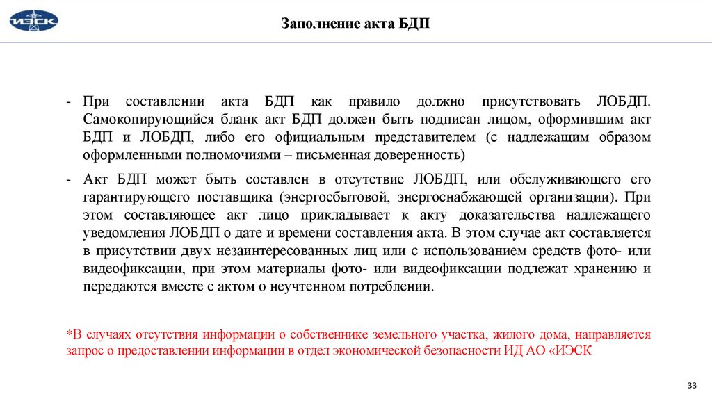 - Акт БДП может быть составлен в отсутствие ЛОБДП, или обслуживающего его