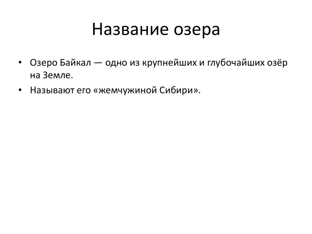 Название озера• Озеро Байкал — одно из крупнейших и глубочайших озёр