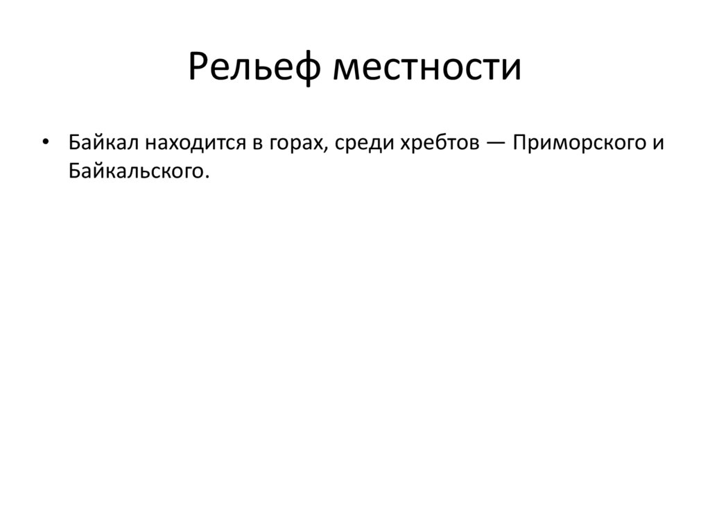 Рельеф местности• Байкал находится в горах, среди хребтов — Приморского и