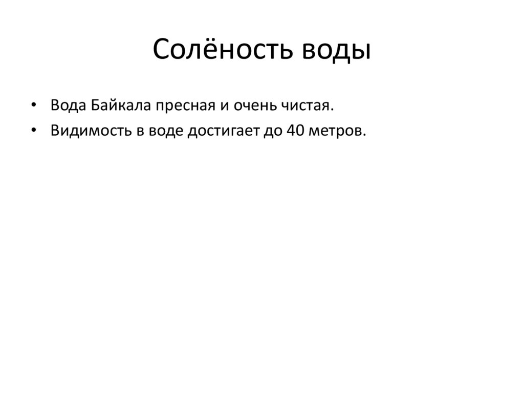 Солёность воды• Вода Байкала пресная и очень чистая.