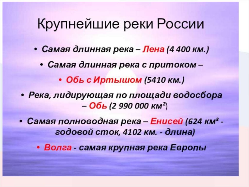 Лена, Енисей, Иртыш, Обь, Волга, Кама.