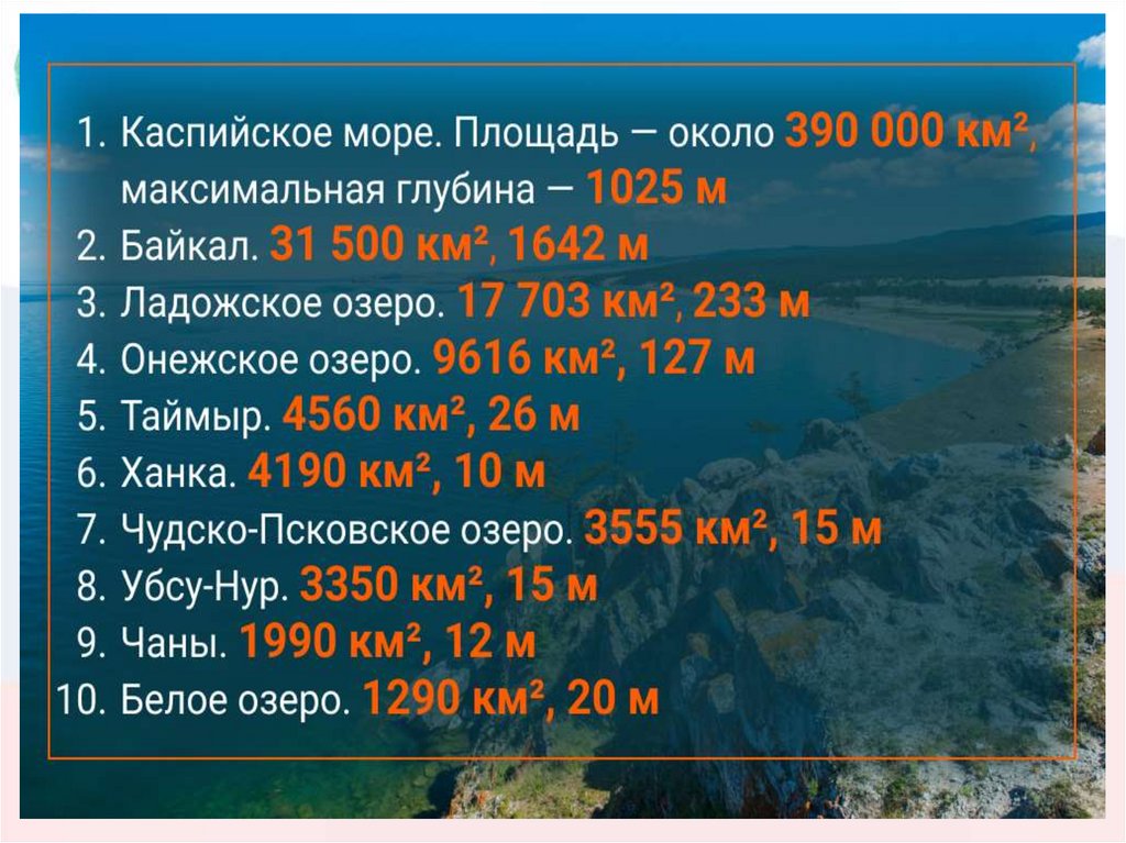 озёра — Каспийское море, Байкал,