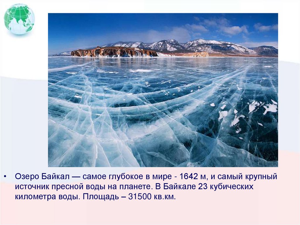 • Озеро Байкал — самое глубокое в мире - 1642 м, и самый крупныйисточник пресной воды на планете. В Байкале 23 кубических