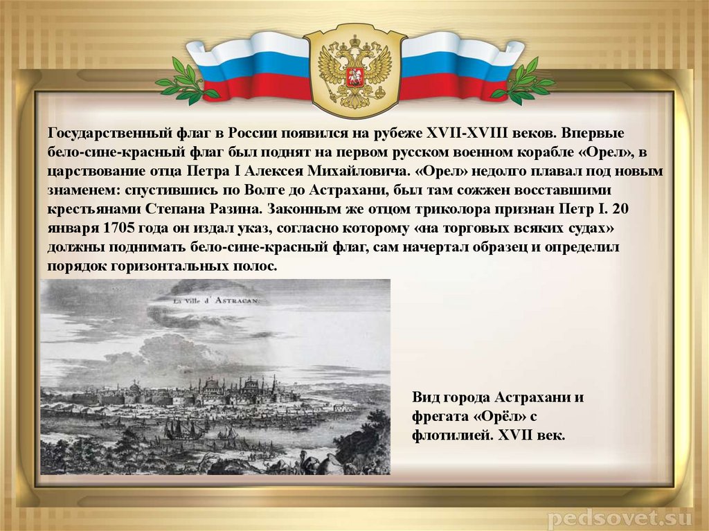 Государственный флаг в России появился на рубеже XVII-XVIII веков. Впервыебело-сине-красный флаг был поднят на первом русском военном корабле «Орел», в