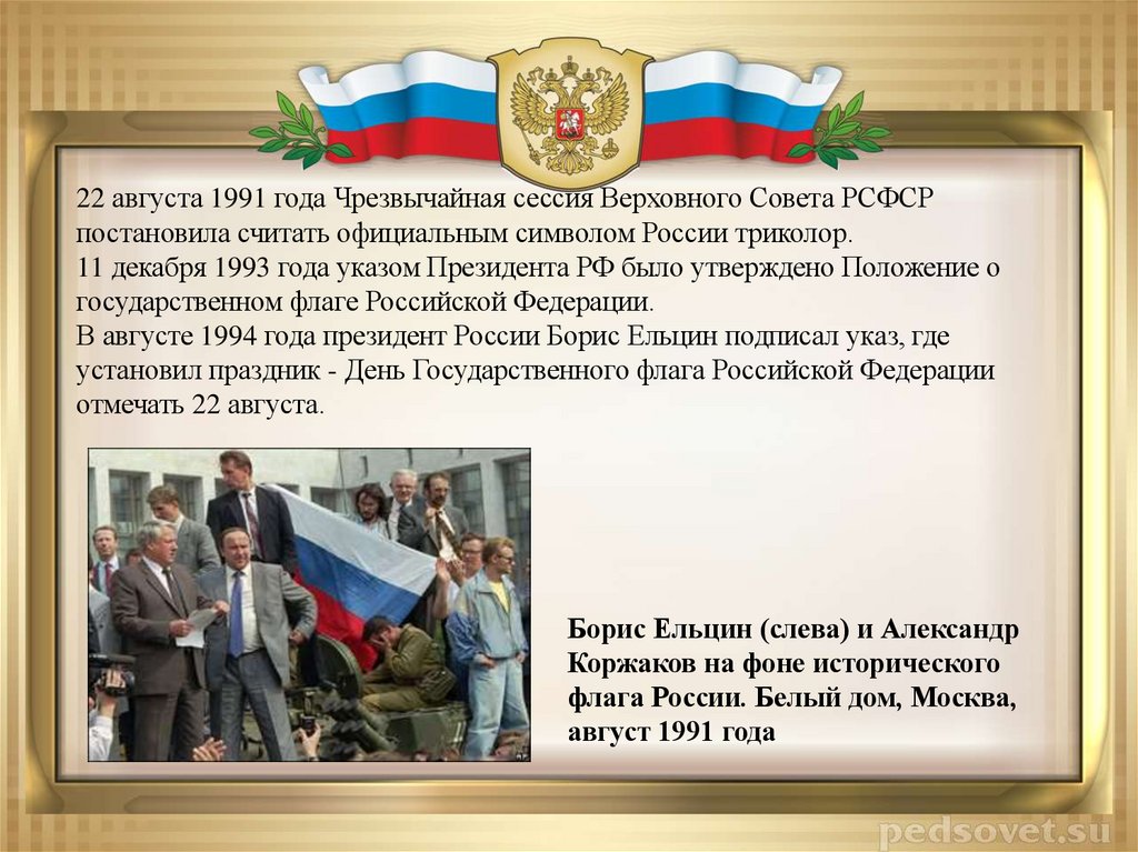 22 августа 1991 года Чрезвычайная сессия Верховного Совета РСФСРпостановила считать официальным символом России триколор.