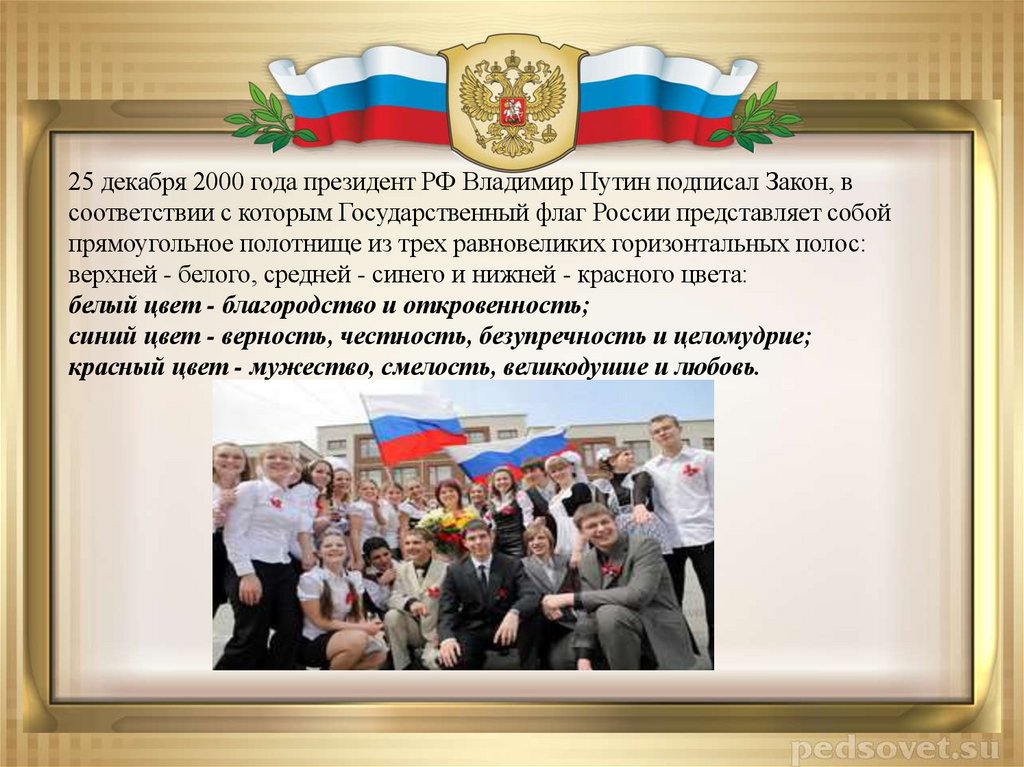 25 декабря 2000 года президент РФ Владимир Путин подписал Закон, всоответствии с которым Государственный флаг России представляет собой