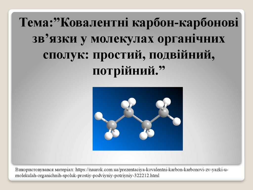 Використовувався матеріал: https://naurok.com.ua/prezentaciya-kovalentni-karbon-karbonovi-zv-yazki-umolekulah-organichnih-spoluk-prostiy-podviyniy-potriyniy-322212.html
