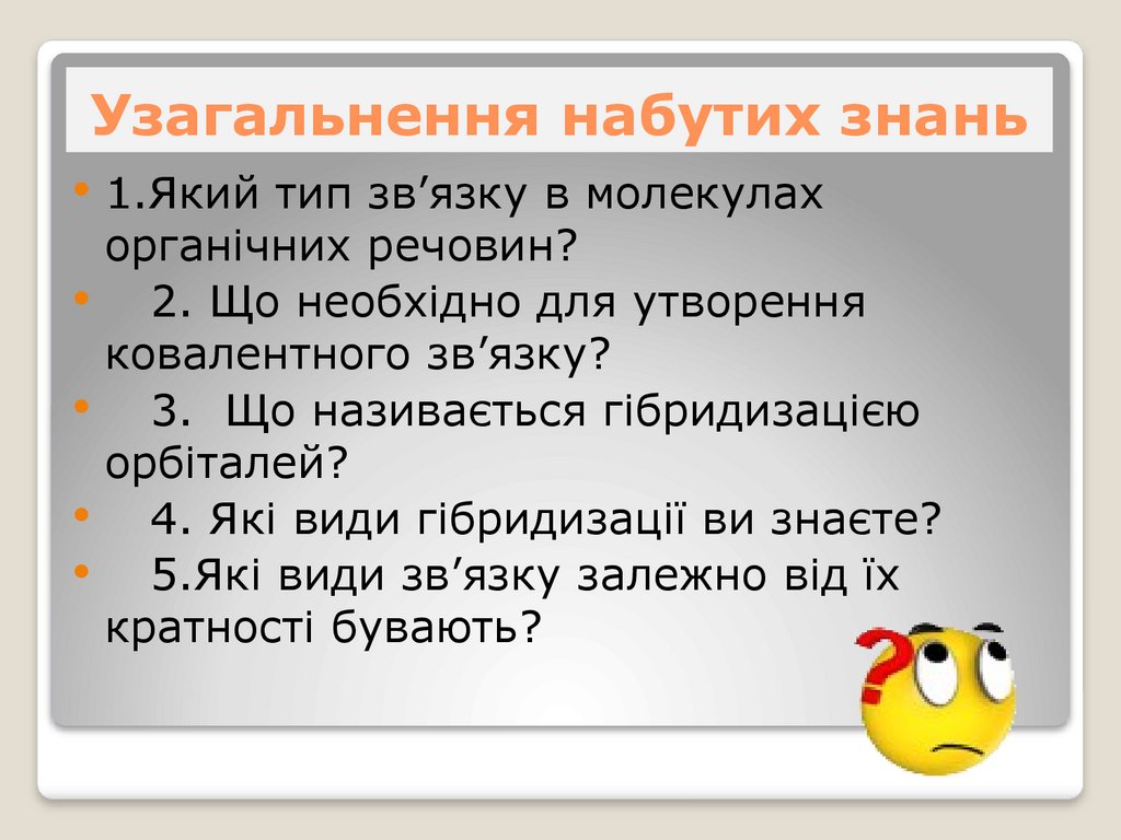 Узагальнення набутих знань1.Який тип зв’язку в молекулах