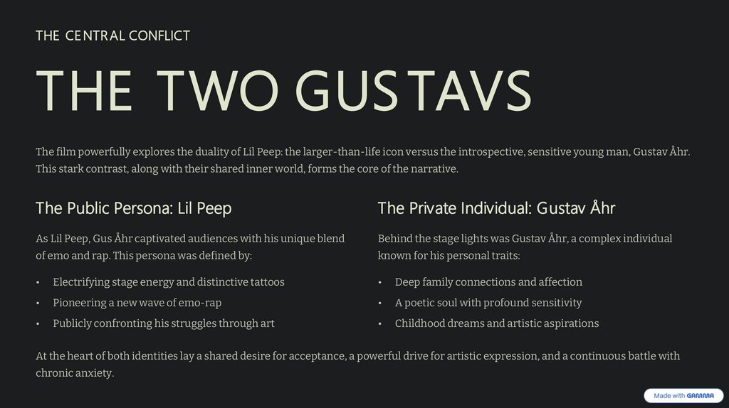 The film powerfully explores the duality of Lil Peep: the larger-than-life icon versus the introspective, sensitive young man, Gustav Åhr.