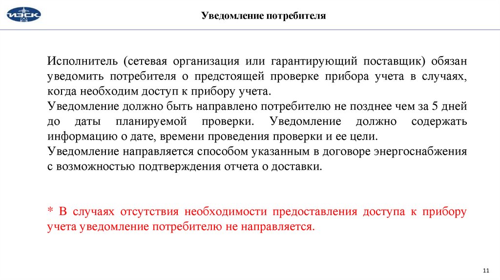 Уведомление потребителяИсполнитель (сетевая организация или гарантирующий поставщик) обязан