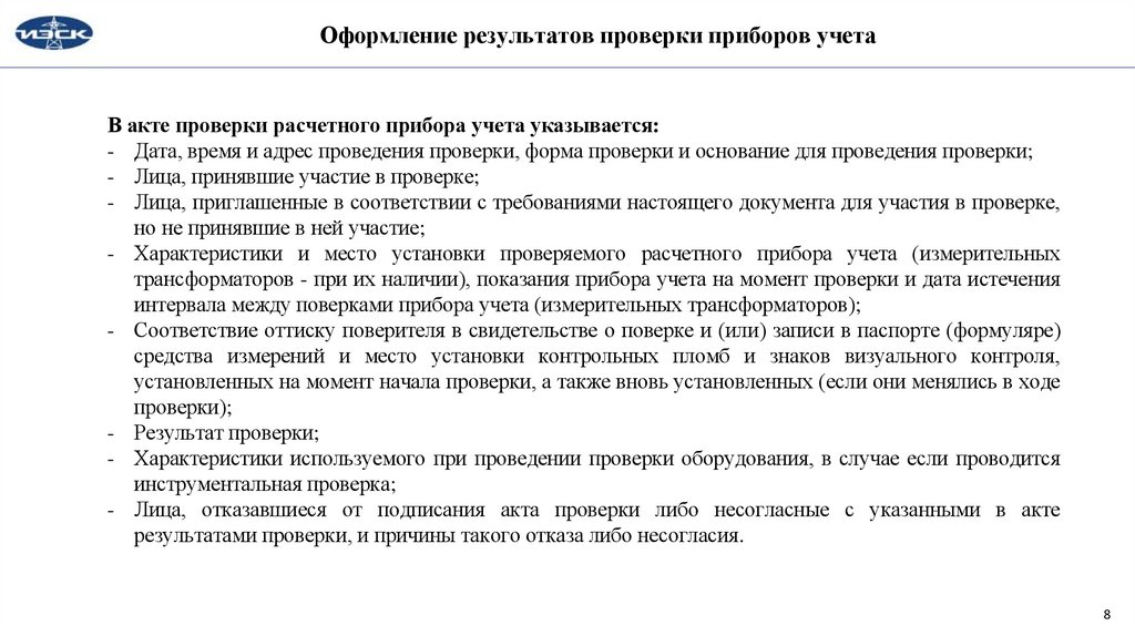Оформление результатов проверки приборов учетаВ акте проверки расчетного прибора учета указывается: