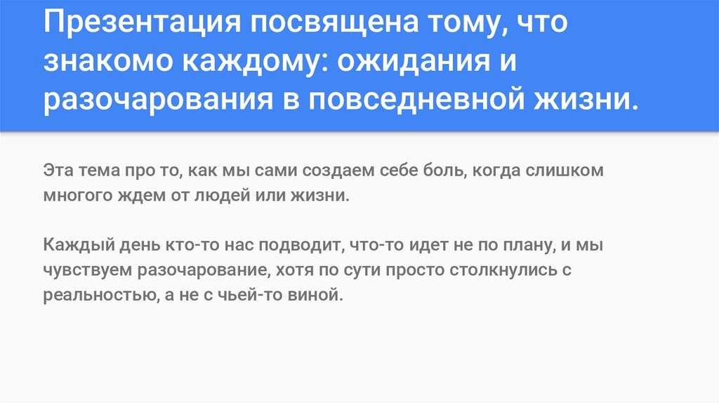 Презентация посвящена тому, чтознакомо каждому: ожидания и