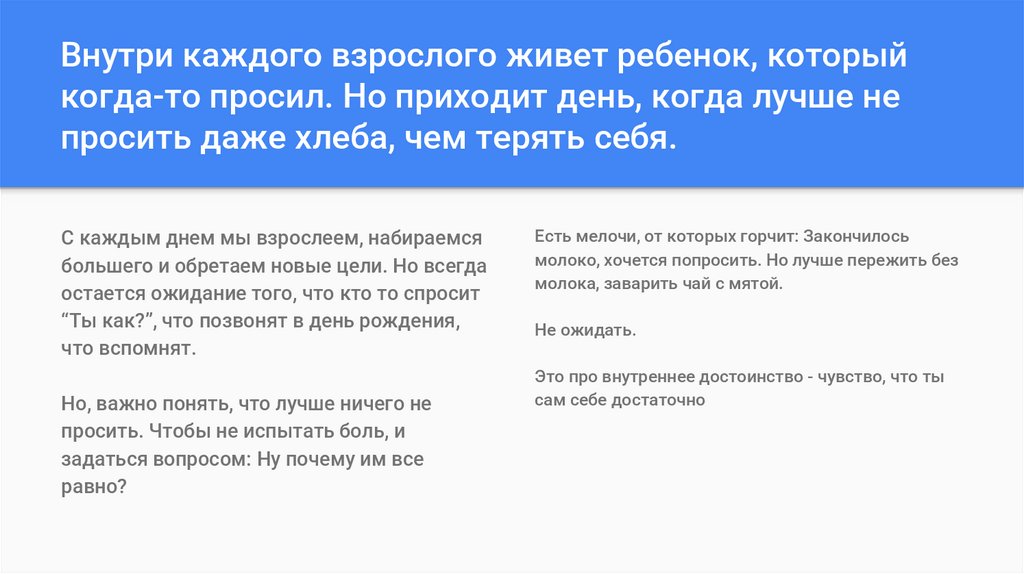 Внутри каждого взрослого живет ребенок, которыйкогда-то просил. Но приходит день, когда лучше не