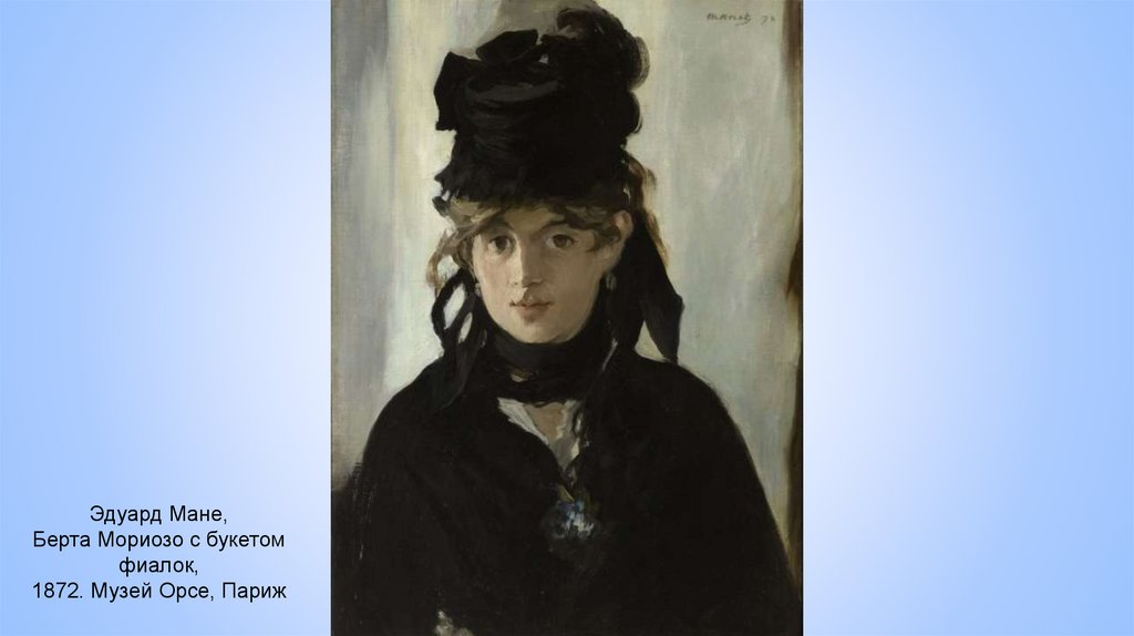 22. Эдуард Мане - Берта Моризо с букетом фиалок Год создания: 1872 Месторасположение: Музей Орсе, Париж