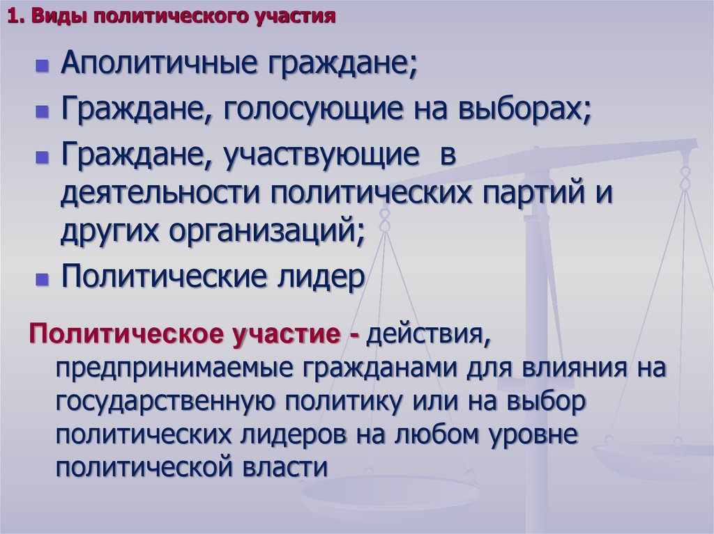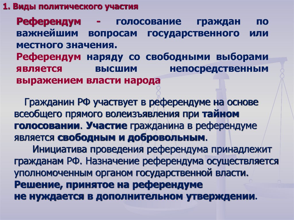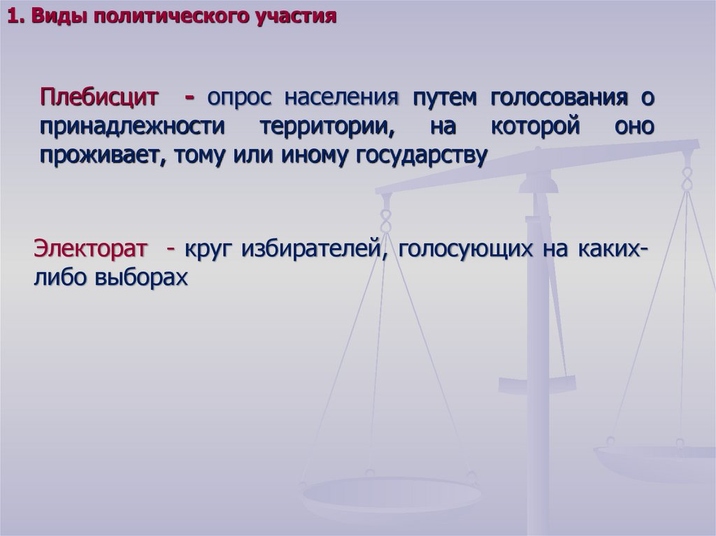 1. Виды политического участияПлебисцит - опрос населения путем голосования о