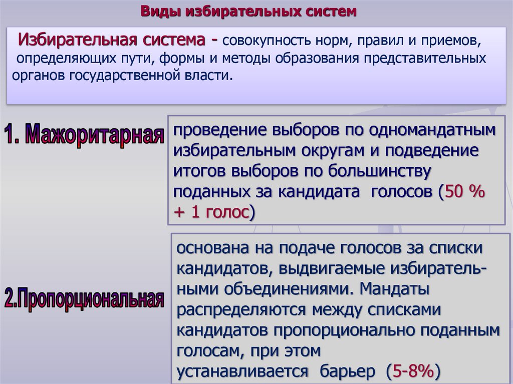 Виды избирательных системИзбирательная система - совокупность норм, правил и приемов,