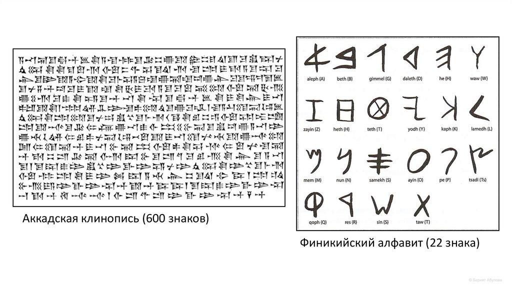 Аккадская клинопись (600 знаков)Финикийский алфавит (22 знака)