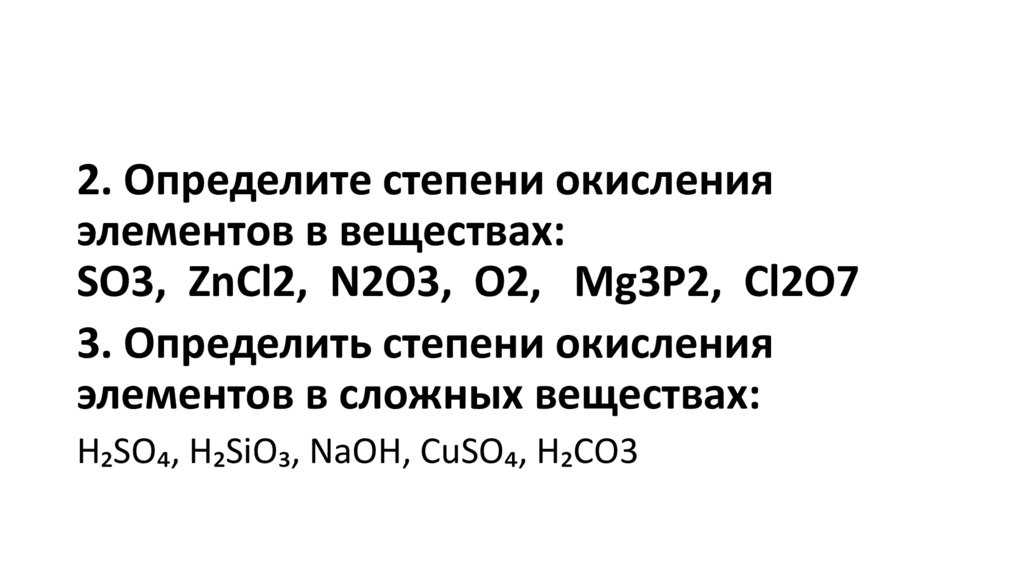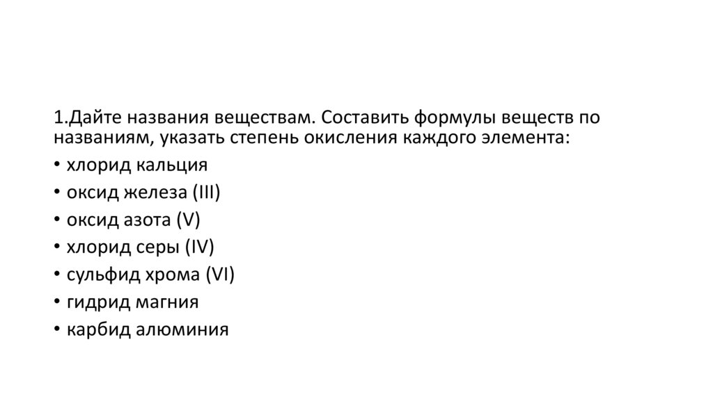 1.Дайте названия веществам. Составить формулы веществ поназваниям, указать степень окисления каждого элемента: