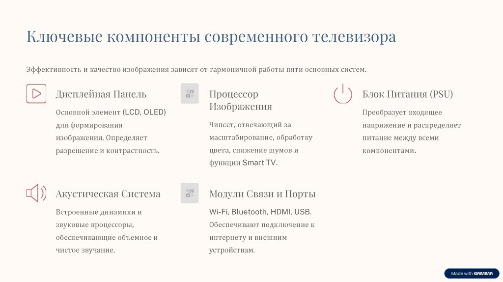 Ключевые компоненты современного телевизораЭффективность и качество изображения зависят от гармоничной работы пяти основных систем.