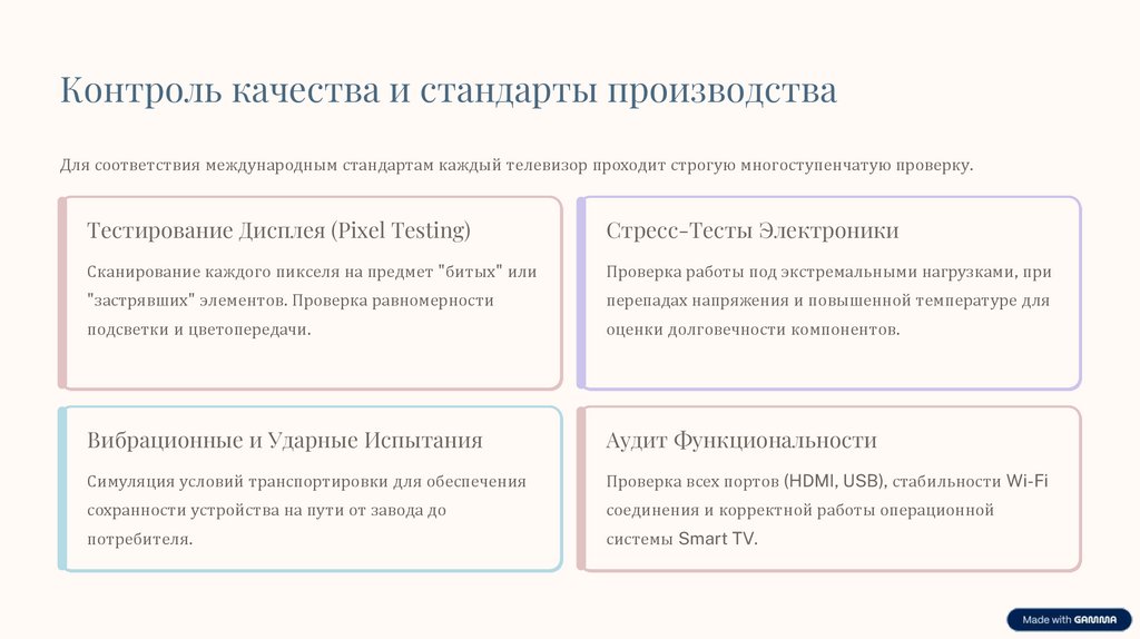 Контроль качества и стандарты производстваДля соответствия международным стандартам каждый телевизор проходит строгую многоступенчатую проверку.