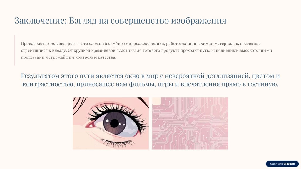 Заключение: Взгляд на совершенство изображенияПроизводство телевизоров — это сложный симбиоз микроэлектроники, робототехники и химии материалов, постоянно