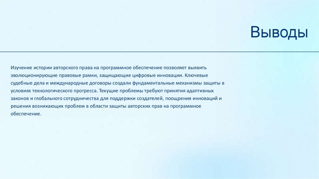 ВыводыИзучение истории авторского права на программное обеспечение позволяет выявить