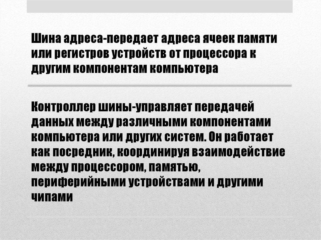 Шина адреса-передает адреса ячеек памятиили регистров устройств от процессора к