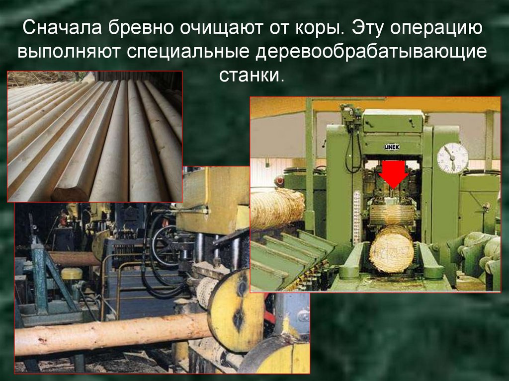 Сначала бревно очищают от коры. Эту операциювыполняют специальные деревообрабатывающие