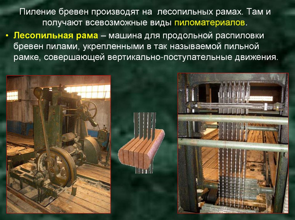 Пиление бревен производят на лесопильных рамах. Там иполучают всевозможные виды пиломатериалов.