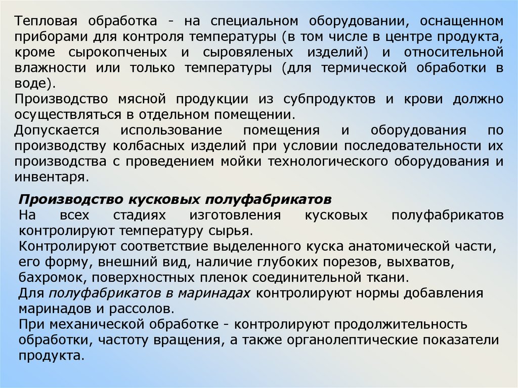Тепловая обработка - на специальном оборудовании, оснащенномприборами для контроля температуры (в том числе в центре продукта,