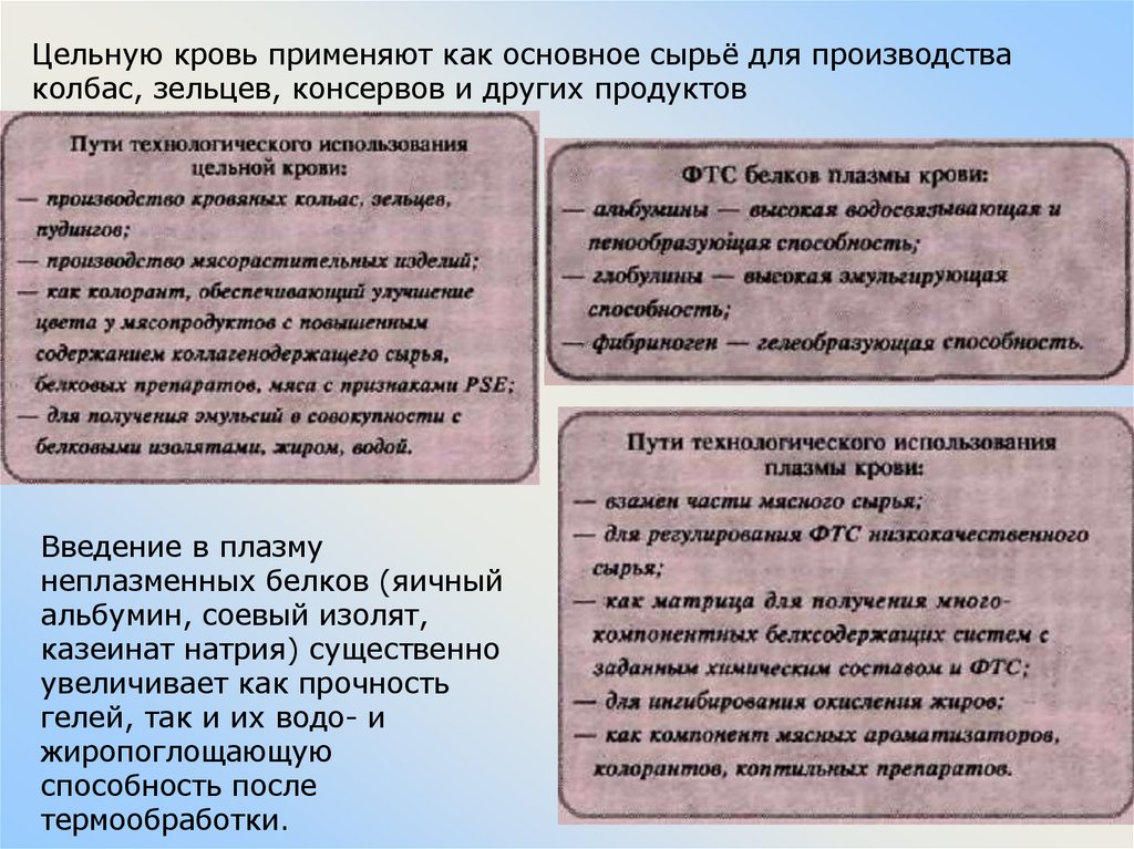Цельную кровь применяют как основное сырьё для производстваколбас, зельцев, консервов и других продуктов